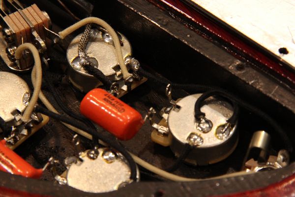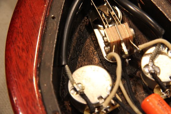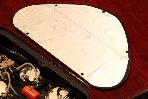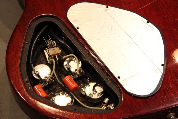 写真はGibson SGのバックパネルを取り外したところです。