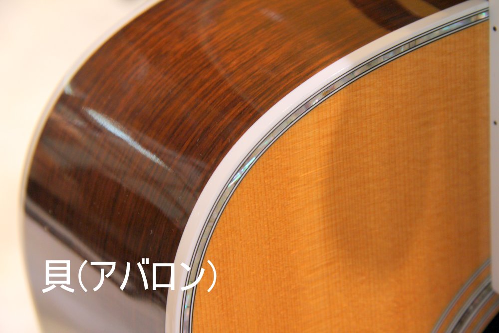 高級機にはこのバインディングが採用されているのをよく見かけます。 キラキラとしてゴージャズ感を醸し出すインレイです! 素材にはメキシコ貝(アバロン)が用いられる事が多いですね。 Martin上位機種(D-42、D-45など)になるとビッシリと施されていて、ため息が出るような美しい仕上がりになっていますよ。画像のように、多くはセルロイドバインディングと一緒に使用されます。